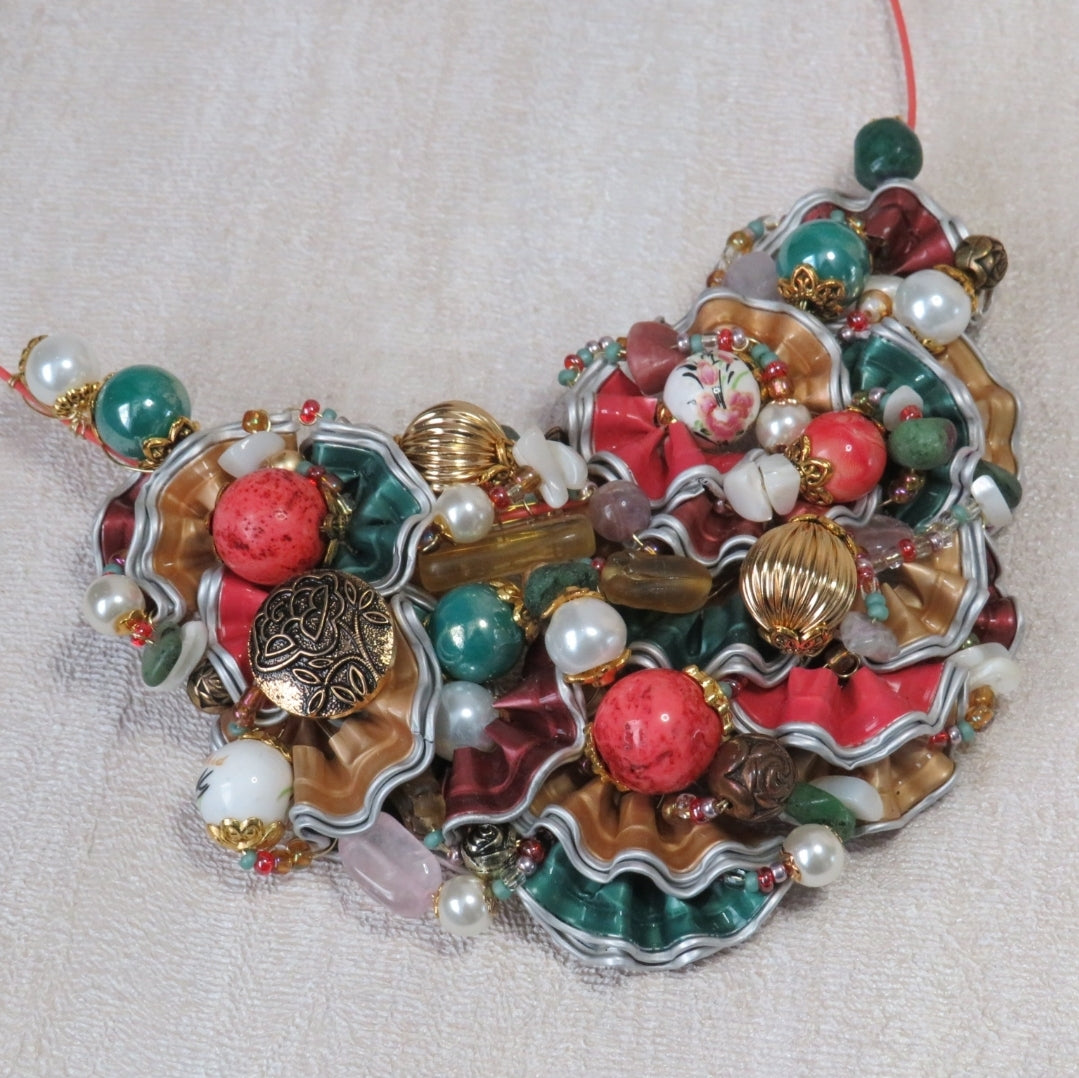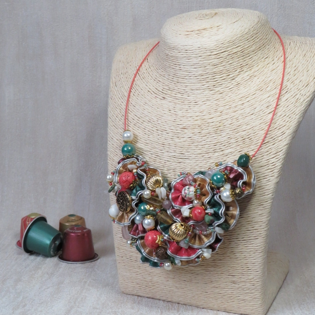 A stunning, intricate neckpiece handcrafted from upcycled aluminium coffee pods, pre-loved and vintage beads and salvaged components from discarded pieces of jewellery. Each neckpiece is wired onto a 15cm round coloured steel wire with the screw closure to the back. A unique statement neckpiece which is surprisingly light.