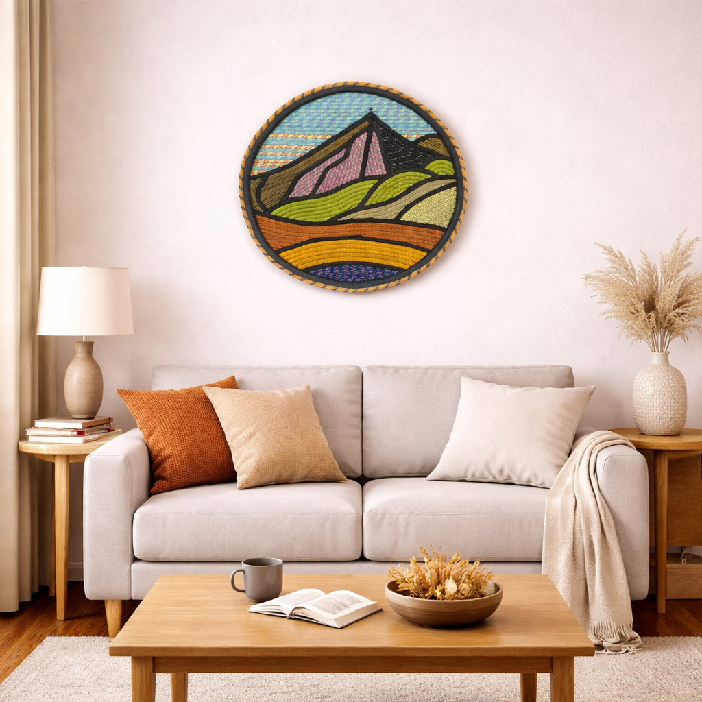 23.5 inch in diameter, plywood backing. Twine attached at rear for hanging