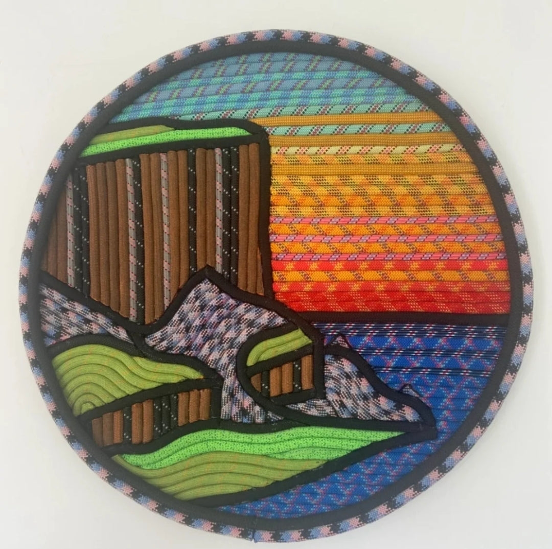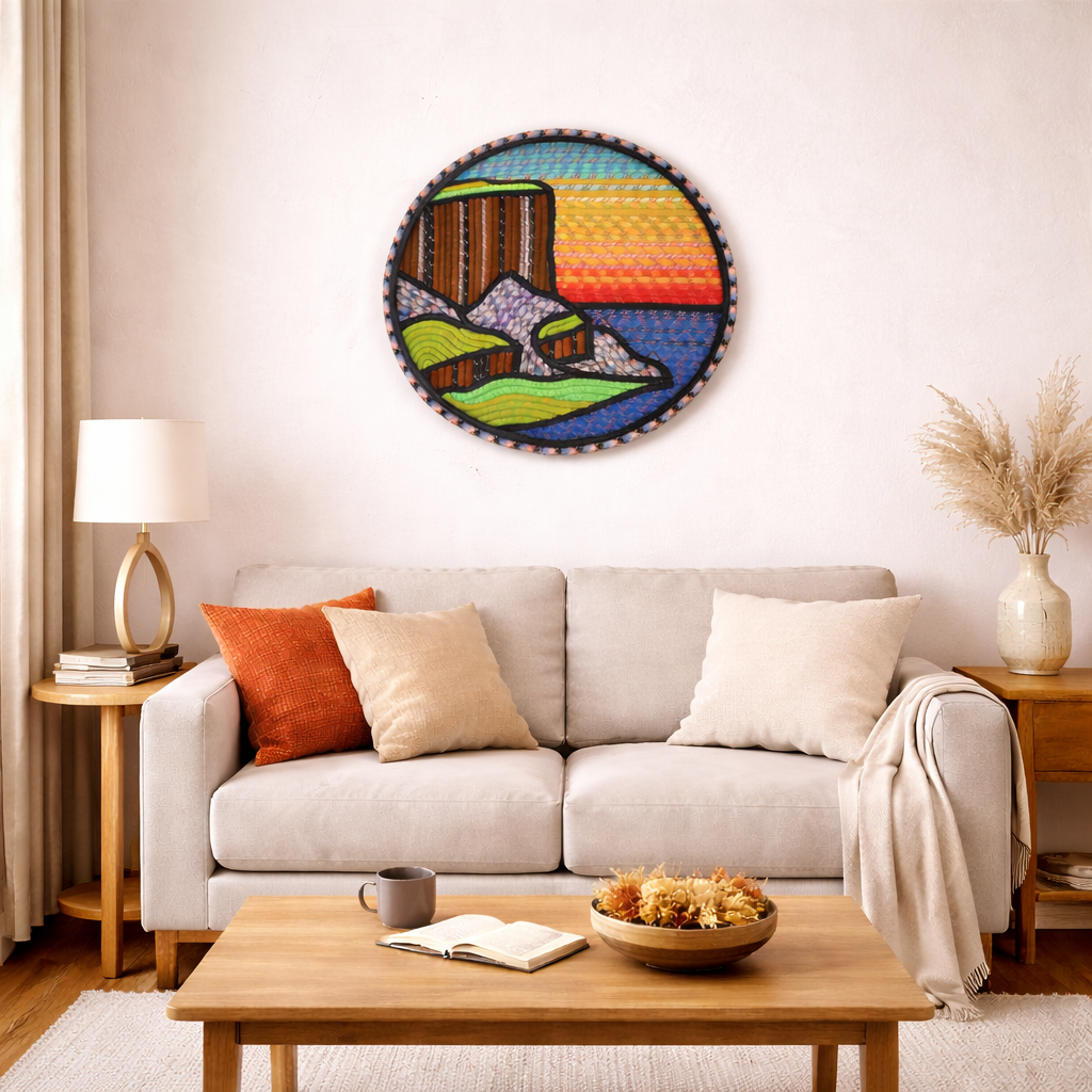 23.5 inch in diameter, plywood backing. Twine attached at rear for hanging