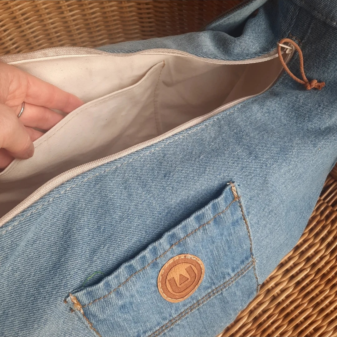 This really versatile bag  can be worn as a casual everyday slouchy bag - or, it is large enough when full, as an overnight/small weekender bag. Fully lined. The cream coloured lining is also repurposed - it used to be a canvas tent. Three internal pockets. Two external  pockets from another pair of jeans. Beige zipper closure with tan pulley. Adjustable strap to wear crossbody or over the shoulder